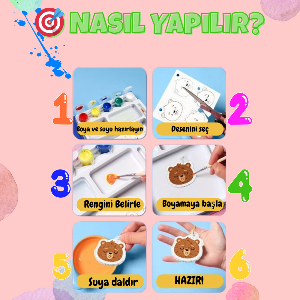 Set içindeki ayı temalı desenler, özel 3D köpük yüzeyler üzerine basılmıştır. Çocuklar bu yüzeyleri istedikleri şekilde suluboya, pastel, keçeli kalem gibi malzemelerle boyar. Ardından desenleri hafifçe suya daldırarak ya da fırçayla ıslatarak köpüklerin kabarmasını izlerler. Ortaya çıkan üç boyutlu etkiyle birlikte renkli ve canlı sanat eserleri oluşur.